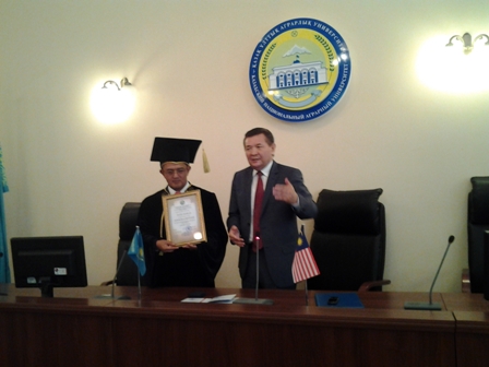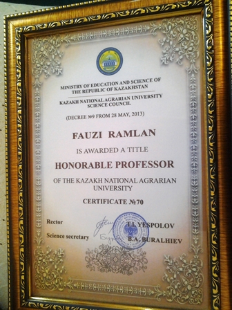 Bersempena dengan majlis menandatangani MoU dan perbincangan berkenaan permulaan kerjasama kedua belah pihak tersebut, Naib Canselor UPM, Prof. Datuk Dr. Mohd Fauzi Ramlan, turut dianugerahkan Profesor Kehormat oleh Kazakh National Agrarian University (Kazakh) dan Kementerian Pendidikan dan Sains, Republik Kazakhstan.